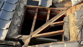 こちらは観音寺市豊浜町内の雨漏り修繕依頼現場です 見積をする前ではありましたが… 訪問時の翌日が雨予報だったため穴が空いていた谷板を...