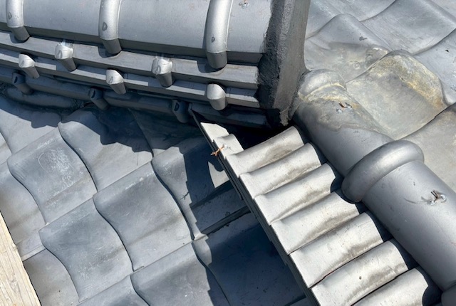 千枚瓦の裾を加工して隅棟の下を通すのではなく妻側に流します