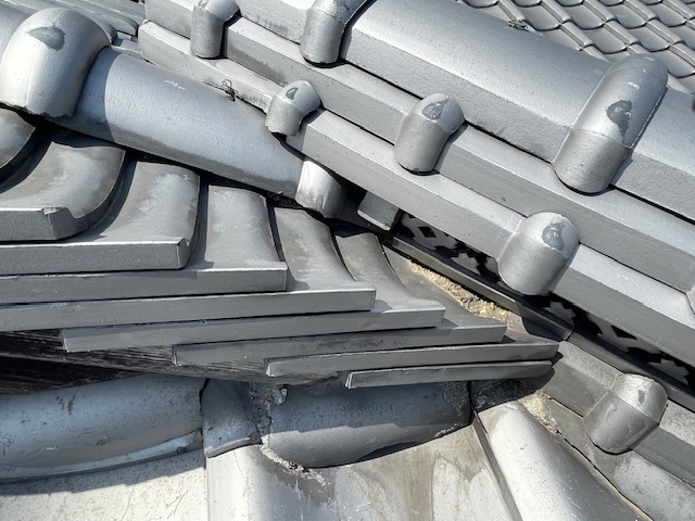 千枚瓦の上を流れる雨水が瓦の下まで入っているように見えますね