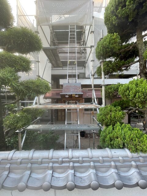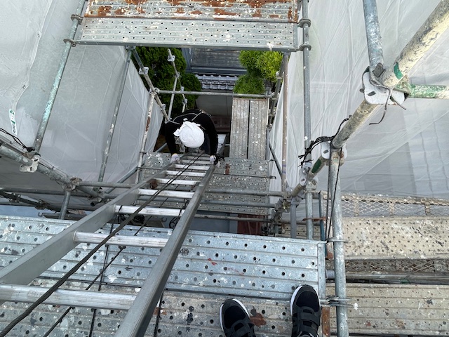 塗装用の外部足場を動かしつつ当社が施工しやすいようにアンチの組み替えを実施