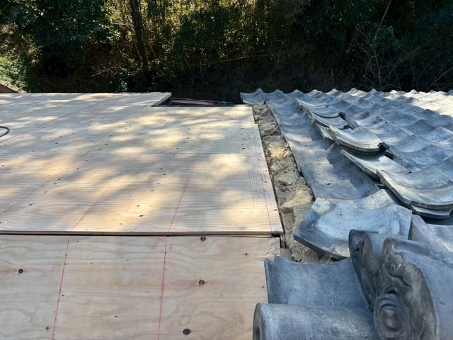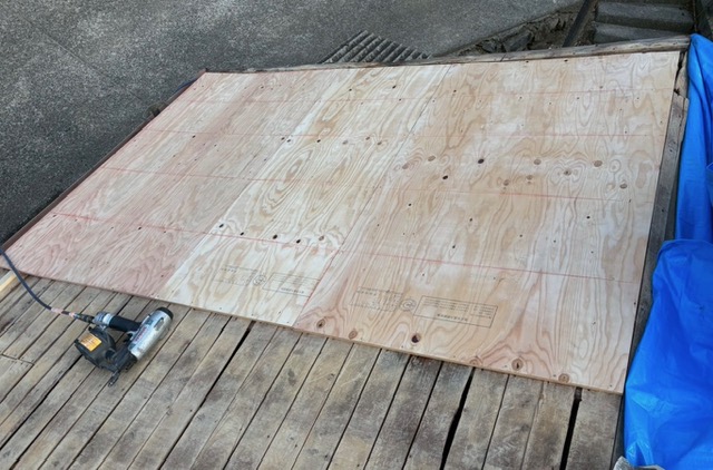 既存の野地板の上から針葉樹合板を増し貼りして下地補強