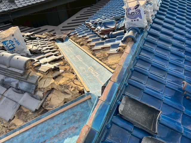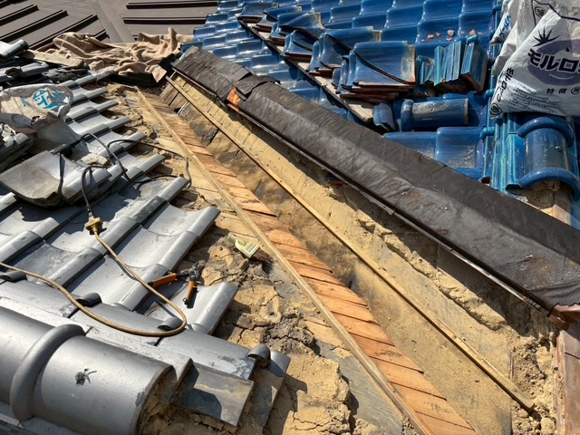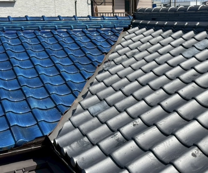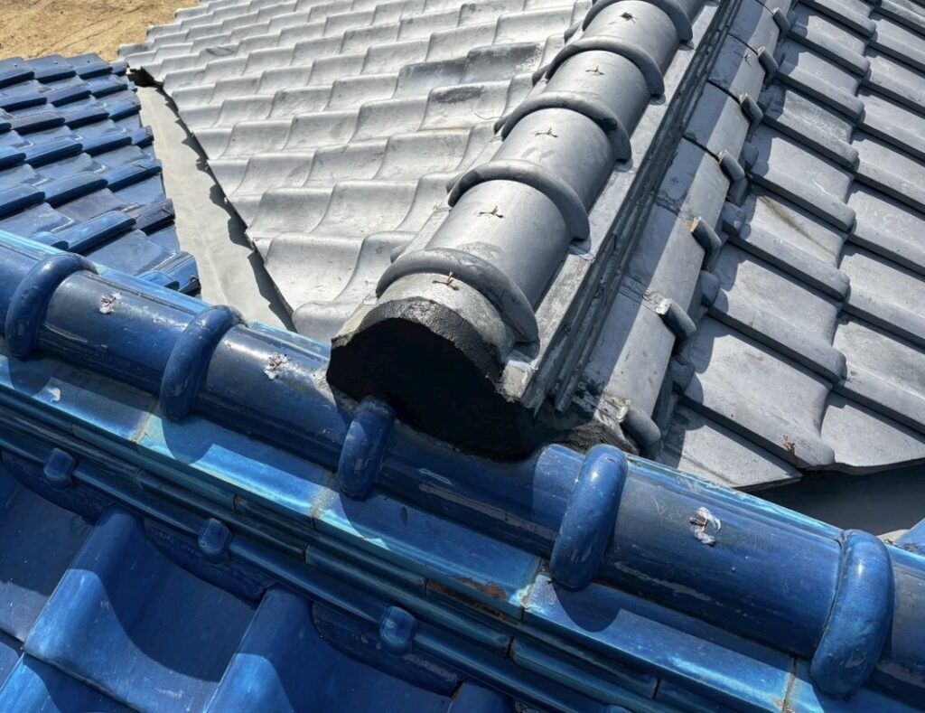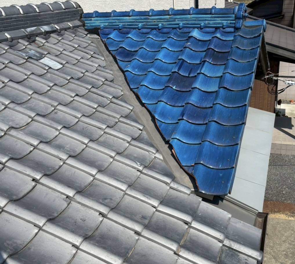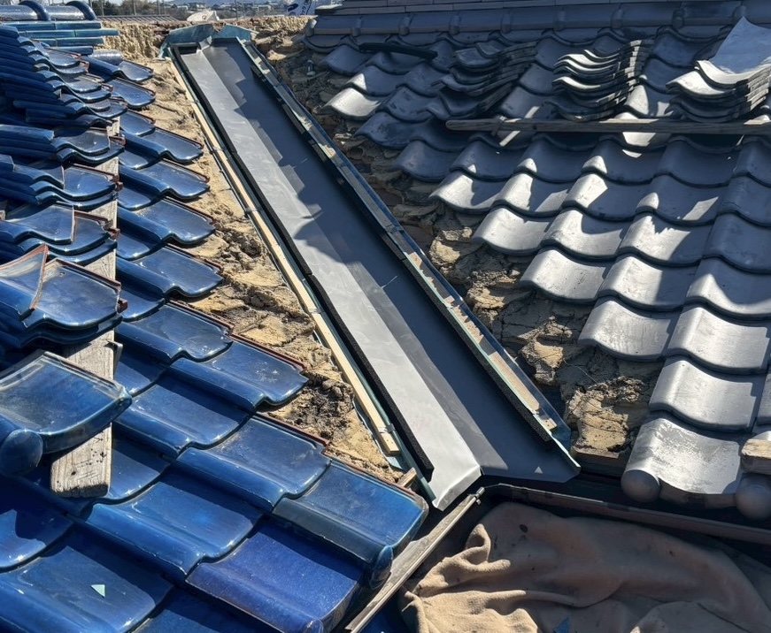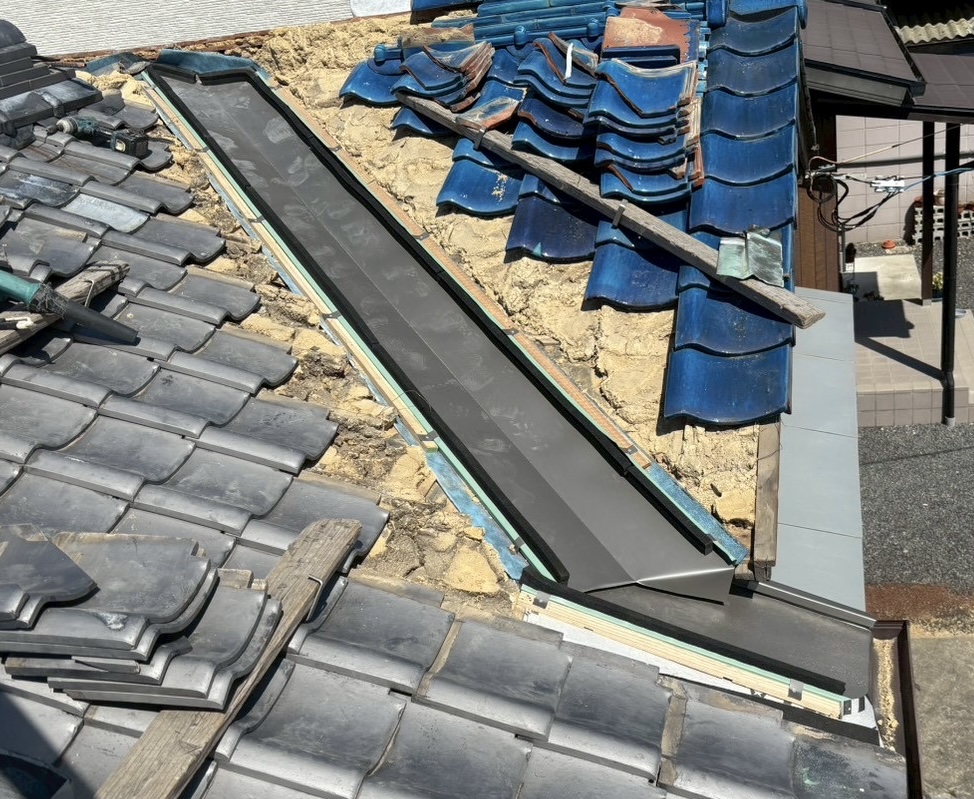 いぶし瓦屋根と釉薬瓦屋根の間の谷入替修理となります