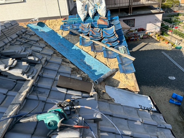 あとは既存瓦を葺き戻しまして…  無事に雨漏り修理(谷板金交換)の完成です