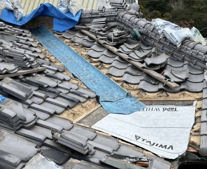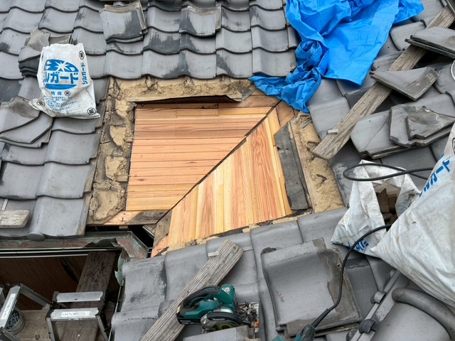 化粧板を張ったその上から改質アスファルトルーフィングを施工