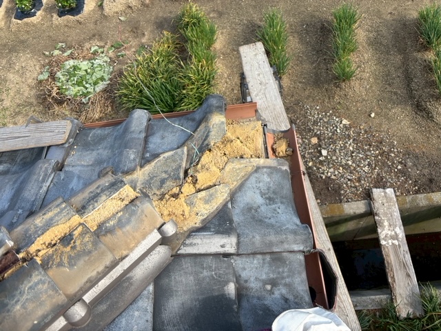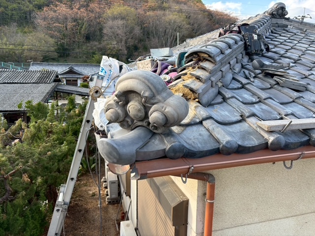 鬼瓦の下にある瓦を直さないといけない為 周辺を一旦解体