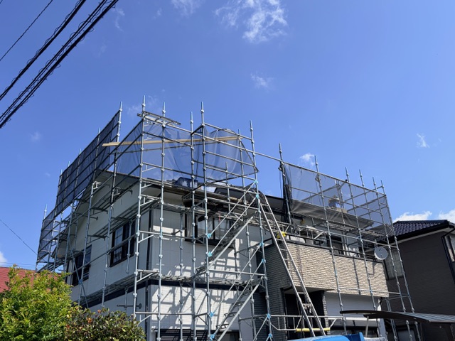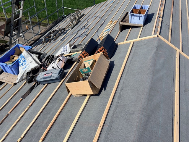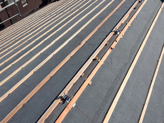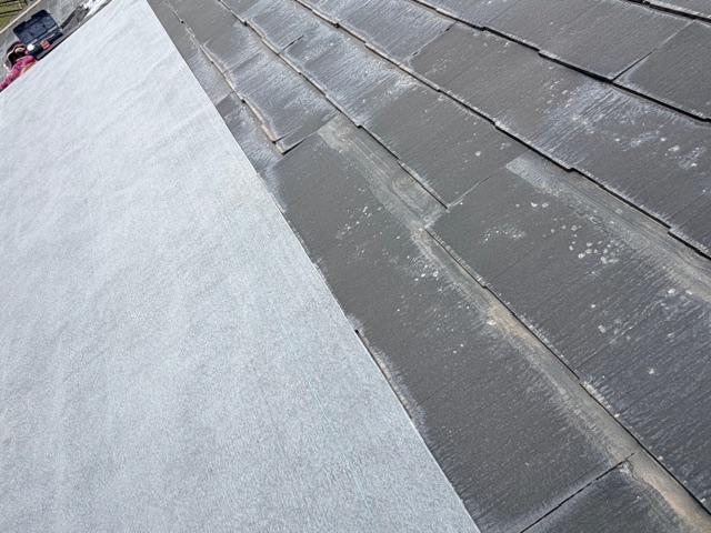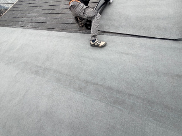 屋根のごみを取り除き 既存屋根材の上から粘着タイプのルーフィングを張っていきます