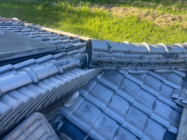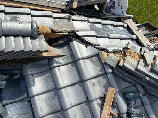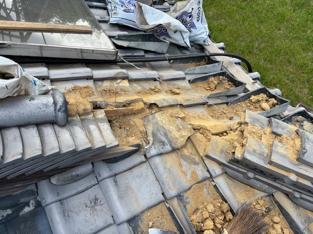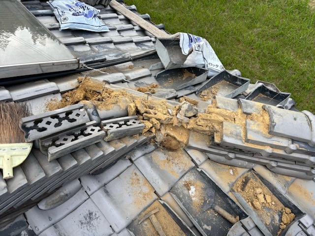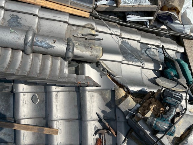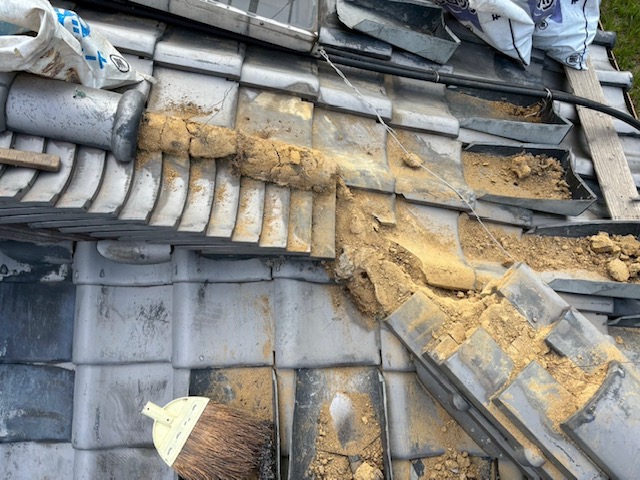 雨水が流れやすいように施した後に解体した隅棟を復旧